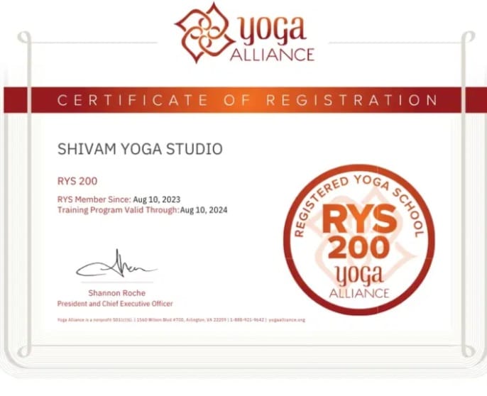 We are affiliated with Shivam Yoga Studio, a Yoga Alliance-Registered School, for our RYT-200 and RYT-500 and Therapeutic Yoga Teacher Training programs. All Certifications earned through our programs will be issued under the name of Shivam Yoga Studio, in accordance with Yoga Alliance standards.”